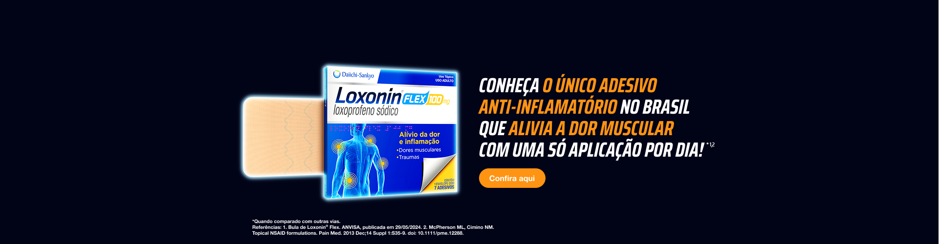 Com um só adesivo, Loxonin® Flex age na inflamação local e na dor muscular, por 24 horas!1-4*